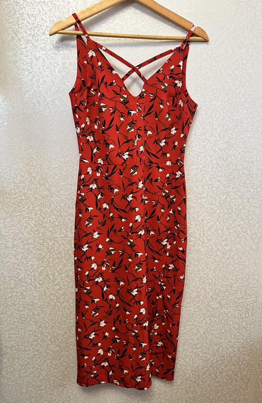 Червона приталена сукня з гарним вирізом спереду та ззаду. Є виріз збоку на нозі. В квітковий принт. Без дефектів. Застібається ззаду на блискавку. Приємний на дотик матеріал. Розмір S. Заміри: Довжина від плеча до низу - 109 см; довжина до талії - 36 см; ПОГ - 37 см; ПОТ - 32 см; ПОБ - 37 см.