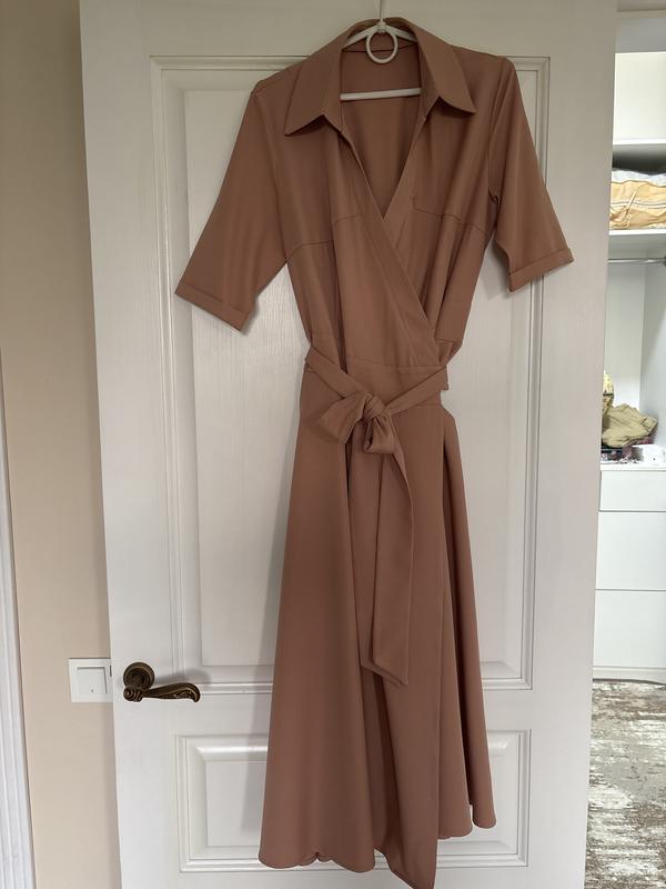 Сукня жіночна силуетна ніжно кремового кольору. Завдяки гарному крою - чудово виглядає на грудях. сукня на запах з довгим поясом. Стильна, елегантна. Може бути як повсякденна, для роботи і особливих випадків. До низу розширена, має кишені. Довжина -119см Ширина по спинці - 50см великий запах - тому на різний ОГ Талія - 40см теж регулюється Плечі - 12см Рукав - 31см
