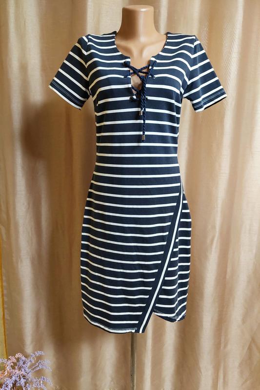 Хорошенькое, в трендовую полоску, классное, повседневное платье. Снизу ассиметричный крой, сверху на шнуровке, садится по фигуре, сзади спинка на молнии. Все бирки срезаны, но и так видно что это натуральная ткань (двухнутка), тянется. Длина 97см, пог 46см, пот 40см, пост45см. Замеры в спокойном состоянии.