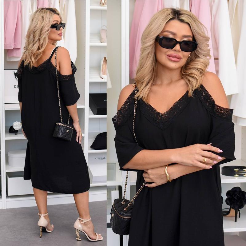 Сукня Модель : 210 Размеры : 50-52 / 54-56 / 58-62 Тканина : льон Бохо жатка з льняним мережевом Цвета: черный, бежевый Стильное и нежное платье силуэтного кроя на брителях, украшенное кружевом из льна. Есть карманы по бокам платья для удобства. Романтичная, легкая и удобная.Ткань очень приятная к телу. Замеры: 50-52 / 54-56 / 58-62 ОГ 118 / 130 / 142 ОС 140 / 150 / 160 Длина рукава 22 / 23 / 24 Длина 108 / 109 / 110