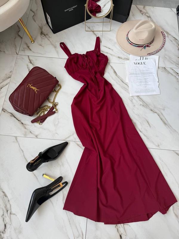 💎💔 Реал фото ‼️ Сукня ▫️Мод 1232 ▫️Тканина - софт шовк ▫️Розміри - 42-44 та 44-46 ▫️Кольори - бордо 🔝Ця міді-сукня з корсетною шнурівкою — як обійми впевненості😍 Гарнопідкреслює талію, грає на світлі та створює настрій💛 Тонкі бретелі, глибокий бордовий відтінок і шнурівка на спині — тут ідеально все ❤️