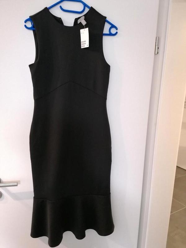 Елегантна чорна сукня міді від H&M, модель з приталеним силуетом. Виготовлена з доволі щільної, гладкої тканини, без рукавів, з округлим вирізом та декоративним швом під грудьми, що формує лінію талії. Нижня частина сукні має широкий волан, що додає образу жіночності та легкості. Застібка — прихована блискавка ззаду. Ця модель чудово підійде як для офіційних подій, так і для вечірніх виходів.