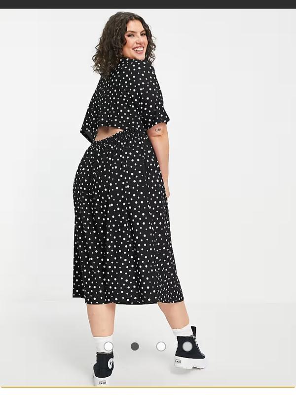 Длинное платье из трикотажа черного цвета в белый горох. Короткий рукав, талия на резинке. Стан идеален. Размер по набору 20. Замеры: под руками - 61см, талия - 51-75см, бедра - 78см, длина по спинке - 120см.