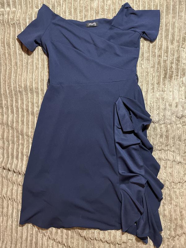 Особливий акцент – каскад об'ємних рюшів по одному боку сукні, що додає динамічності, жіночності та неповторного шарму.Приталений силует, який елегантно підкреслює фігуру, а довжина міді або трохи вище коліна (залежить від зросту) робить її універсальною. Матеріал: 95% поліестер, 5% еластан – тканина добре тягнеться, приємна до тіла, тримає форму і мінімально мнеться. Бренд Feverfish .Стан Б/у, в ідеальному стані – була з біркою, не одягалася, без будь-яких дефектів, виглядає як нова.Вказаний розмір 18 (британський), що відповідає приблизно європейському XL або 46-48 розміру.