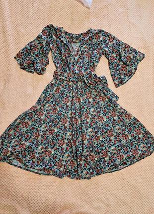 Красивое платье из вискозы, сочным зеленого цвета в цветочки, лиф на запах, рукав и юбка клеш. Длина 107 см, плечи 42 см, под руками 104