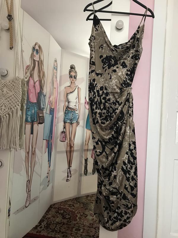 Легкое летнее асимметричное платье с воланами и разрезом на ноге в отличном состоянии. Очень приятная легкая эластичная ткань, сзади молния. Маломерит. Размер производителя XL, но подойдет на М, возможно L.
