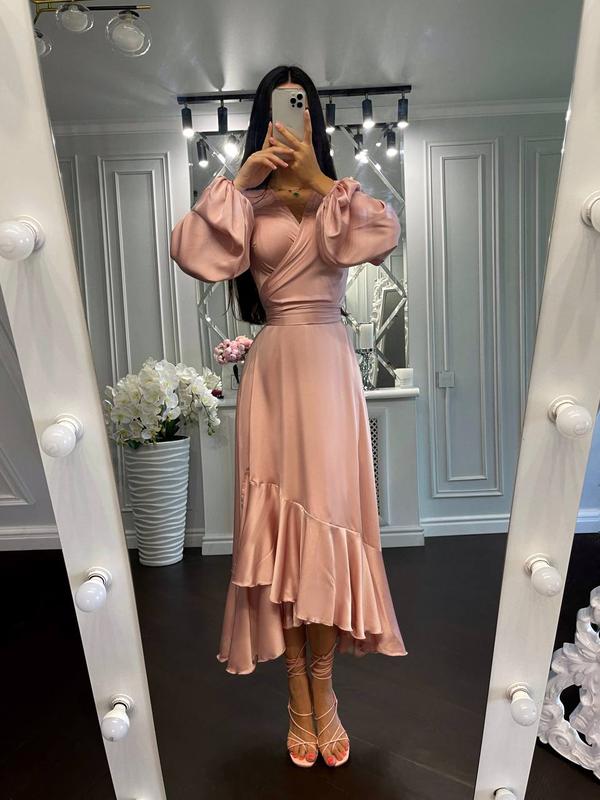 Нереальной красоты платье из нежнейшего эко шелка🤩 5 м тканини💞 Сукня на запах Материал - плотный искусственный шелк Размер 44 Цвет бежево-розовый Длина 129 см ПОГ 45 см ПОТ 37 см рукав 75 см
