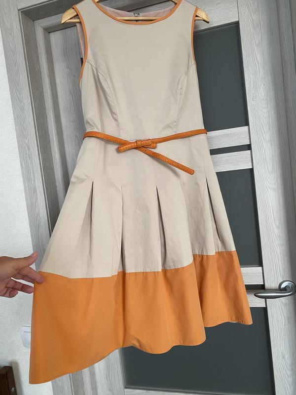 Літня сукня Debenhams, розмір М. В ідеальному стані. Вказано розмір 16, але це розмір М. Довжина 102 см, довжина до лінії талії 42 см, плечі 38 см, нпог- 50 см, талія 1/2- 44 см, стегна 1/2- 57 см, на підкладці. Тканина - 98% бавовна, 2%- еластан.