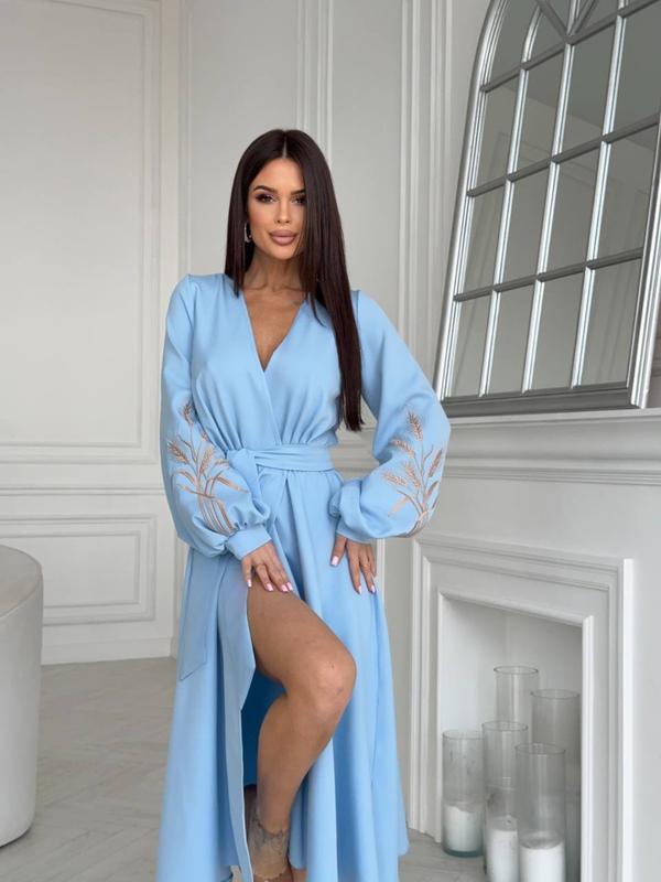 Платье на запах с вышивкой Модель 7507tivar Размер S (42),М (44),L (46), ХЛ (48) 2XL,3XL Тканина: костюмка Длина: 117 см Длина рукава: 67 см Цвета: зеленый, черный, молочный, голубой