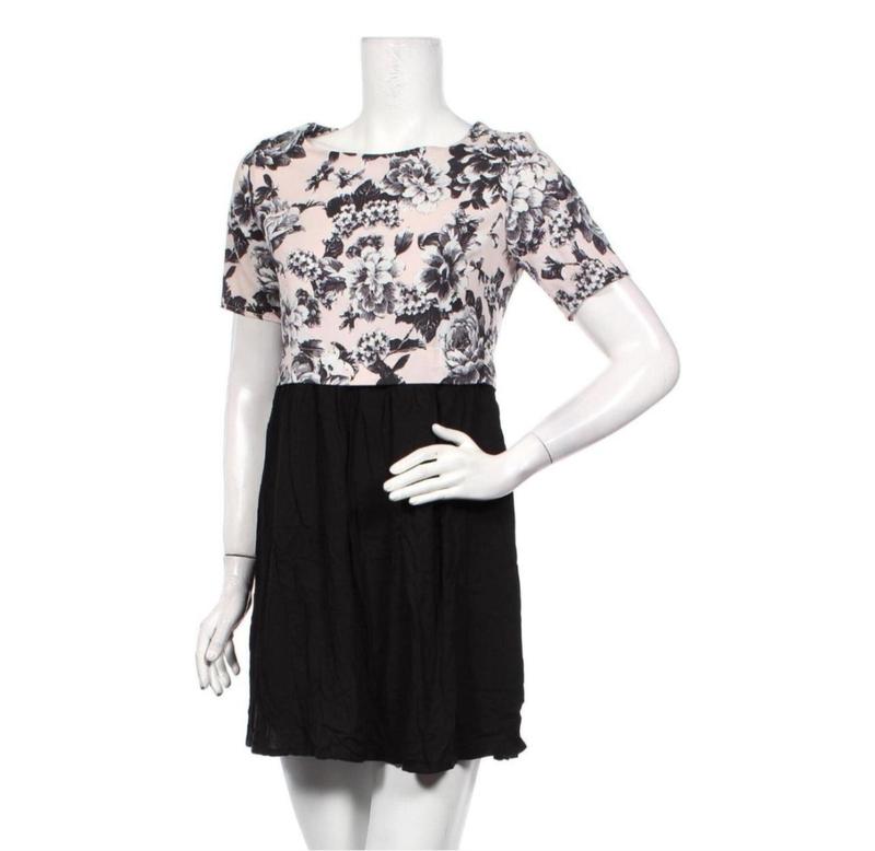 Размер: Зазначений на бірці: UK 8, EU 36 Украинский размер: около 42-44 (S-M). Размер 160/84А на бирке указывает на рост 160 см и обхват груди 84 см. Верх платья выполнен в светло-розовом (пудровом) цвете с изящным черно-белым цветочным принтом, придающим образу нежности и романтичности. Низ платья – классическая, однотонная черная юбка, которая отлично контрастирует с верхом и создает элегантный силуэт. Платье имеет короткие рукава и застежку-молнию сзади, обеспечивая комфортную посадку. Идеально подойдет как для повседневной носки, так и для особых событий.