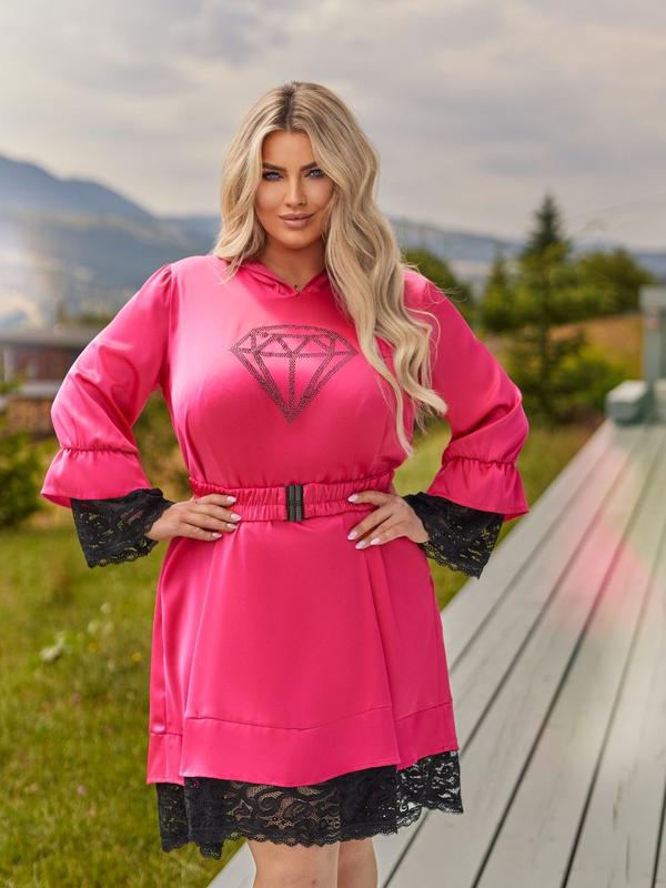 Сукня з капюшоном « ДІАМАНТ « # 1038 ● Розміри - 48-50, 52-54, 56-58, 60-62. ● Тканина: Сатин- Армані чудової якості + гіпюр + мереживо + стрази якості DMS + ПОЯС в комплекті. ● Фактичні виміри: За 52-54 розміром. ▪︎ Довжина від плеча- 102 см. Рукава від плеча- 42 см.- з мереживом- 55 см. ▪︎ ОГ - 124 см. ▪︎ ОТ- 136 см. ▪︎ ОБ - 150 см. ▪︎ По подолу- 184 см. ● До кожного наступного розміру додавати + 4см (на поодинокі розміри). На спарені +8см,крім довжини виробу. ● Зріст моделі на фото- 170см. На моделі одягнений: 52-54 розмір. ▪︎ Параметри моделі на момент зйомки: БЛОНДИНКА: ОГ- 115 см. ОТ- 82 см. ОБ- 120 см. ● ФАСОН ТА ДЕТАЛІ: ▪︎ Ефектна сукня фасону трапеція, виконана з високоякісної тканини Сатін-Армані. ▪︎ Модель з капюшоном, що додає стилю та сучасного вигляду. ▪︎ Рукави оздоблені розкішним мереживом та гіпюром — акцент на жіночність. ▪︎ Спереду — декор у вигляді стразового Діаманту, що виблискує при світлі. ▪︎ У комплекті — еластичний пояс із фіксатором, який підкреслює талію. ▪︎ Низ сукні також прикрашений мереживною вставкою, що створює вишуканий силует. ● ДОДАТКОВІ ХАРАКТЕРИСТИКИ: ▪︎ Ідеальна як для святкових подій, так і для стильного повсякденного образу. ▪︎ Тканина не просвічує, приємна до тіла, легка у догляді. ▪︎ Кишені з боків — зручно та функціонально. ▪︎ Капюшон додає нотку стрітстайлу, а мереживо — жіночності. ▪︎ Еффектно виглядає як на високих так і на низьких підборах. Кольори виробу: Чорний. Мокко. Фісташковий. Рожевий. Сірий- графіт. Електрик.