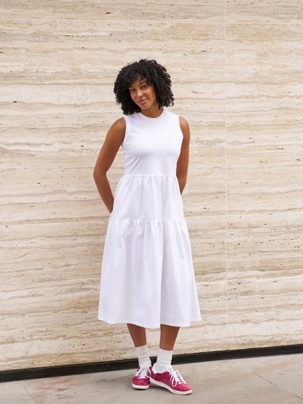 Цвет: 00 БЕЛЫЙ-Размер: Женский xs Полуобъем груди 42 талии де отрезная часть 35длина топа до талии 38 длина платья от плеча 111 см Гладкий хлопковый трикотаж премиум класса. Удобный крой, не стесняющий фигуру, с ребристым вырезом горловины и проймами. Привлекательная многоярусная юбка. Карманы с обеих сторон. - Эффектно смотрится самостоятельно, но также отлично смотрится под кардиганами или рубашками. Немного прозрачный - Подкладка: Без подкладки - Карманы: С карманами Основная часть: Подкладка карманов: 100% хлопок/Ток ребристая ткань: 65% хлопок, 35% полиэстер Мерсеризованный хлопок - это хлопок, который прошел специальную обработку, известную как мерсеризация. Эта обработка предусматривает кратковременную обработку хлопковой пряжи или ткани насыщенным раствором гидроксида натрия, с последующим промыванием и нейтрализацией. В результате волокна хлопка меняют свою структуру, становятся более гладкими, прочными и имеют шелковистый блеск.
