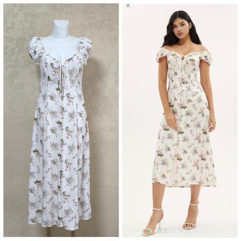 Платье миди Primark с цветочным принтом, облегающая и расклешенная. Модель изготовлена из смеси льна и вискозы, который имеет яркий летний принт. Декольте украшена сборкой на груди, позволяющей подчеркнуть зону декольте, придавая силуэту изящество и легкость. Рукава-фонарики на резинке позволяют носить платье как с поднятыми, так и спущенными плечами, а застежка на пуговицы спереди и вырез в форме сердца создают ощущение вневременной элегантности и добавляют игривости и женственности. ✨ Стан - идеальный ✨ РОЗМІР: 12 ✨ЗАМІРИ: ✨ Состав: 83% вискоза, 17% лён
