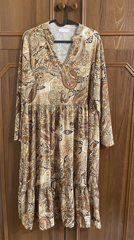 Плаття довжини міді в стильний принт «пейслі».Підійде як на літо з босоніжками,так і на осінній період з теплим кардиганом і ковбойськими чоботами.Рукав 55см,довжина 108 см,ПОТ-46см