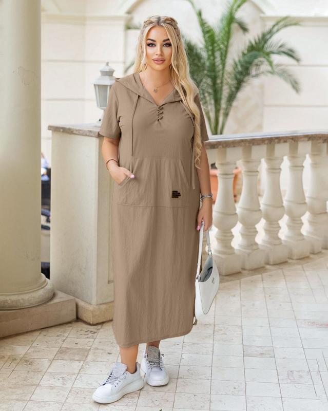 Платье с капюшоном и короткими рукавами мод МАФ-023 Размеры: 48-50 Ткань: лакоста летняя ( обладает хорошей растяжимостью) Кольори: моко Замеры 48-50 ОГ108, ОС 118 см. Довжина рукава 22 см, пройма 23 см. Длина изделия 115 см