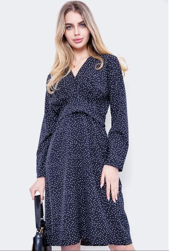 Легкое платье миди с длинными рукавами синяя в горошек гофре