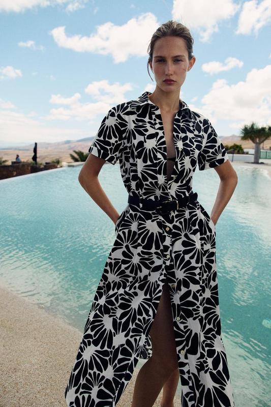 Розмір М та розмір Л. 100% коттон, бавовна Сукня з коміром, V-подібним вирізом і короткими рукавами. Бічні кишені в швах. Застібка на ґудзики спереду з поясом.