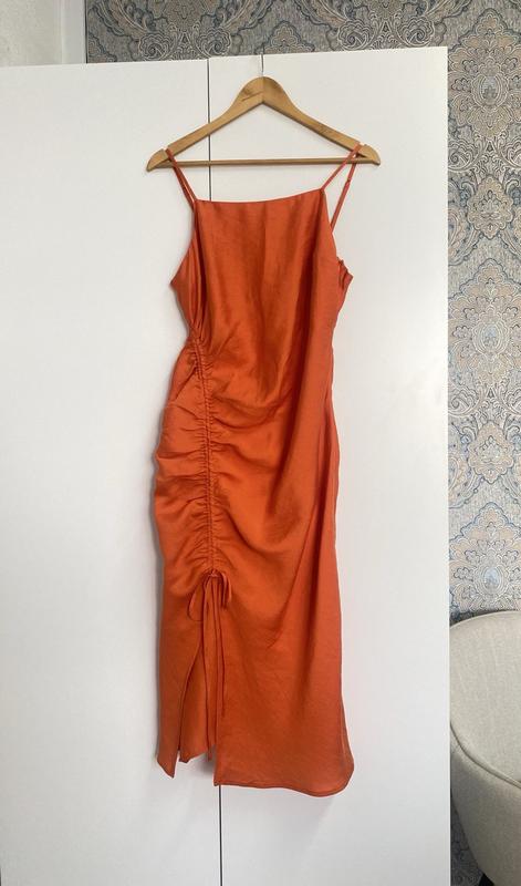 Сукня на тонких бретельках , які регулюються. Збоку замочок. Дуже гарно лягає по фігурі . Є розріз . Заміри груди до 47 см бедра до 53 см довжина спереду без бретелей 113 см довжина ззаду без бретелей 89 см