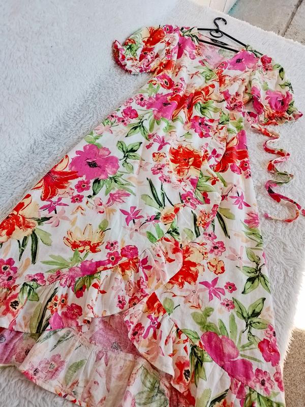 Яркое льняное миди платье на запах F&F. Короткие объемные рукава. Натуральная ткань. Размер 6 Длина 100/127 пог +-45 пот +-40 поб +-60