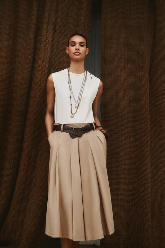 Сукня міді з круглим вирізом горловини та без рукавів. Контрастна комбінована тканина. Спідниця зі складками та шльовками. Ремінь з металевою пряжкою. Бічна застібка на приховану блискавку в шві. ВЕРБЛЮЖИЙ/БІЛИЙ | ************