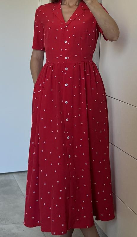 Яркое красное платье в горох на пуговицах Без пояса Полуобхват груди: 45 Напівобхват таліі: 36 Длина:127 В плечах: 37 см