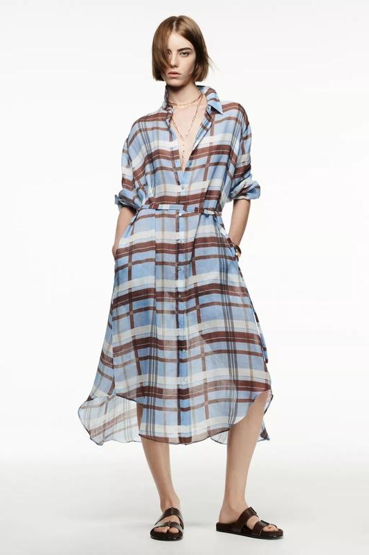 Сукня зі 100% рамі. Комір із лацканами та довгі рукави з манжетами. Пояс із тієї ж тканини регулюється зав’язками. Асиметричний низ із бічними розрізами. Застібається спереду на ґудзики. Показати більше СВІТЛО-СИНІЙ | 8377/036/406