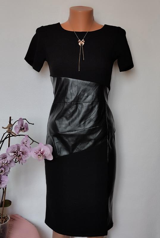 Бомбезна чорна сукня з вставками із шкірозамінника з невеличким розрізом на нозі. Стан загалом ідеальний, але є невеличка дірочка на розрізі, на фото показано, на носіння не впливає. Розмір вказано 10, але буде значно менше, дивіться заміри: довжина 95 рукав 17 пог 38-42 пот 36-38 пос 42-46: