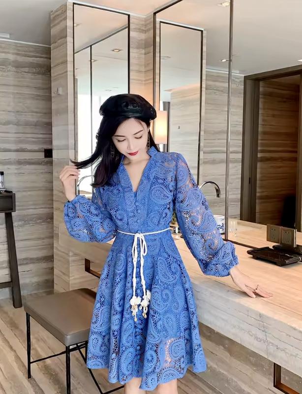 Ажурна блакитна сукня з віскози — розмір S/М Неймовірно ніжна та жіночна сукня з ажурної тканини кольору небесної блакиті. Виріб має V-подібний виріз, довгі об’ємні рукави на манжетах і легкий розкльошений крій, що красиво підкреслює талію. Ідеально підходить як для прогулянок, так і для особливих подій. • Матеріал: м’яка віскоза з мереживом • Підкладка: є (не просвічується) • Розмір: універсальний S-M • Стан: нова, без пояса • Колір: блакитний із візерунком • Довжина: до коліна Сукня виглядає дуже ефектно як із поясом, так і без нього. Ідеальна для літа та міжсезоння.