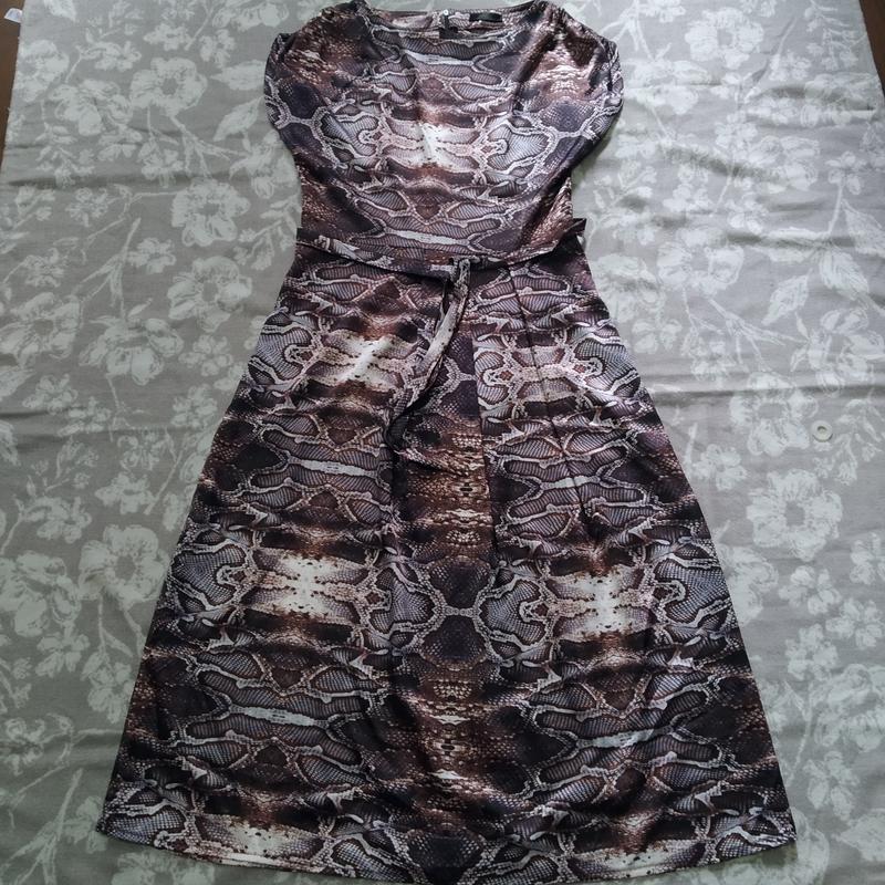 Легкое платье из материала похожего на шелк в котором будет не жарко летом, приятное на ощупь ткань в принт под рептилию. Платье отрезное по талии, есть поясок, по спинке молния длиной 44 см. ПОГ - 48 см, ПОТ- 39 см, длина изделия - 116 см.