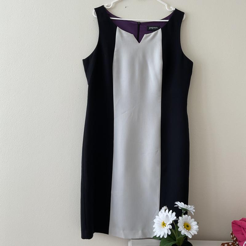 Отличное платье на 48-50 размер. Крой делает стройно, удлиняет силуэт. Замеры: между подмышками 54 см, в бедрах объем 112, длина 97. По спине молния. На красивой подкладке. Состав: полиэстер, вискоза, эластан. Можно носить под жакет.