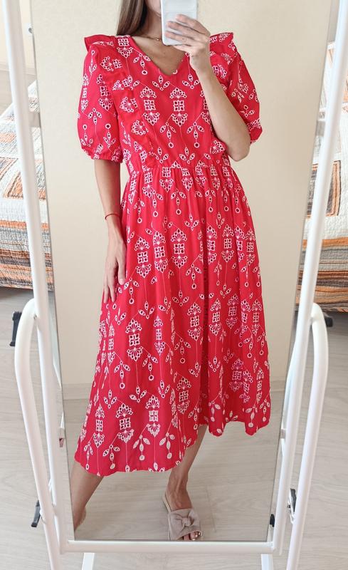 Летнее красное платье из прошвы. Состояние отлично. Тканина не тягнеться. Есть подклад. На талии резинка, тянется. Бирки отсутствуют. Хорошо подойдет на размер 40, смотрите замеры. 100% котон Длина 116см Плечи около 40см Пог 49-50см Пот 39-45см Поб свободно,максимум 74см Оплата на карту!!