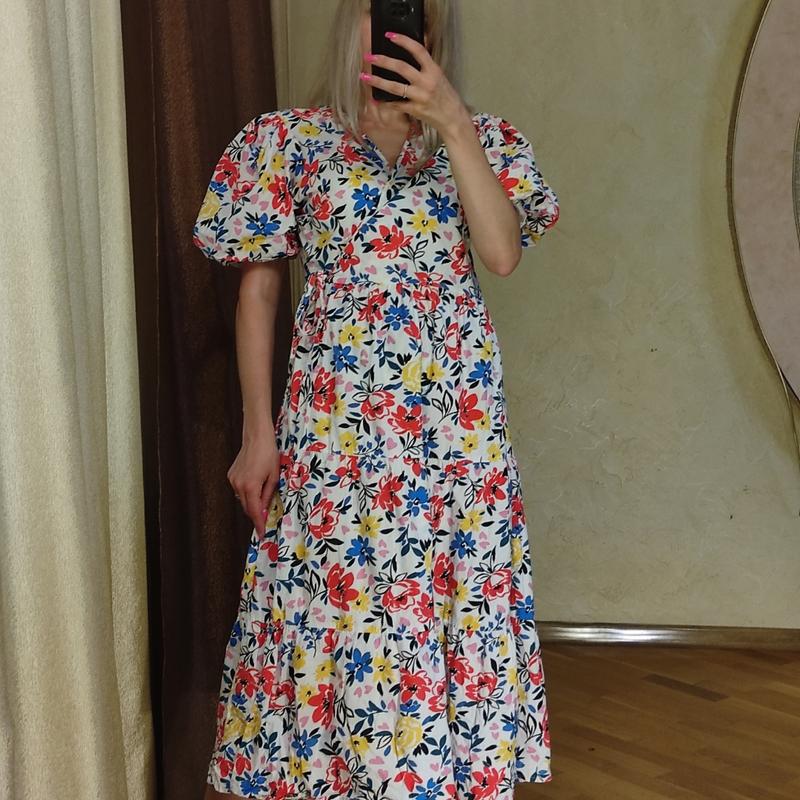 Коттоновое платье миди с цветочным принтом на запах Размер указанный 14 Подойдет на L-XL ПОГ - 53, ПОТ - 48, ПОБ - свободно,61. Длина 117. 100% котон 499 грн Легкая, дышащая, изготовлена из качественной хлопковой ткани - идеальный выбор на жаркие дни. Объемные рукава и крой на сейчас добавляют образу нежности и романтики. Яркий летний принт делает это платье универсальным - и на каждый день, и на особую встречу 😉