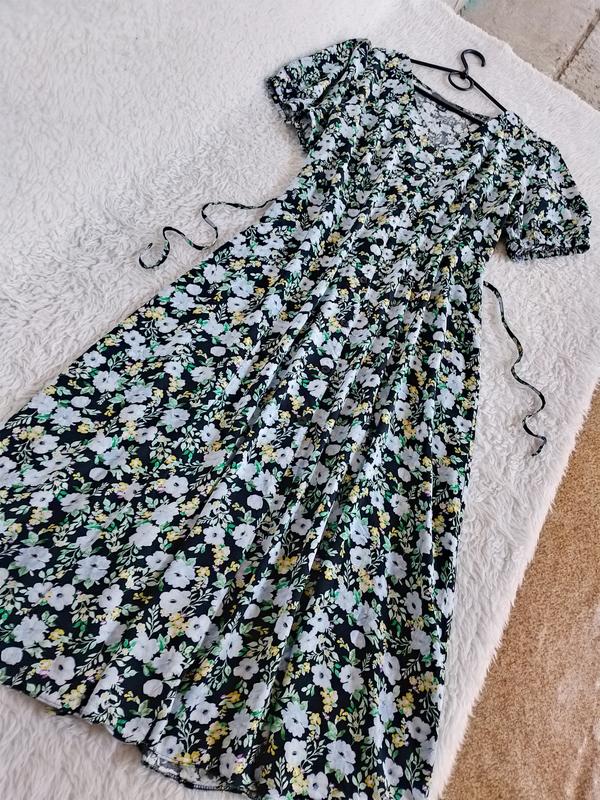 Віскозне мідіплаття Primark. Короткі об'ємні рукави. По всій довжині йде на ґудзиках. З боків пришитий тонкий поясок. Розмір 14 Довжина 122 пог 52 пот 48 поб 65