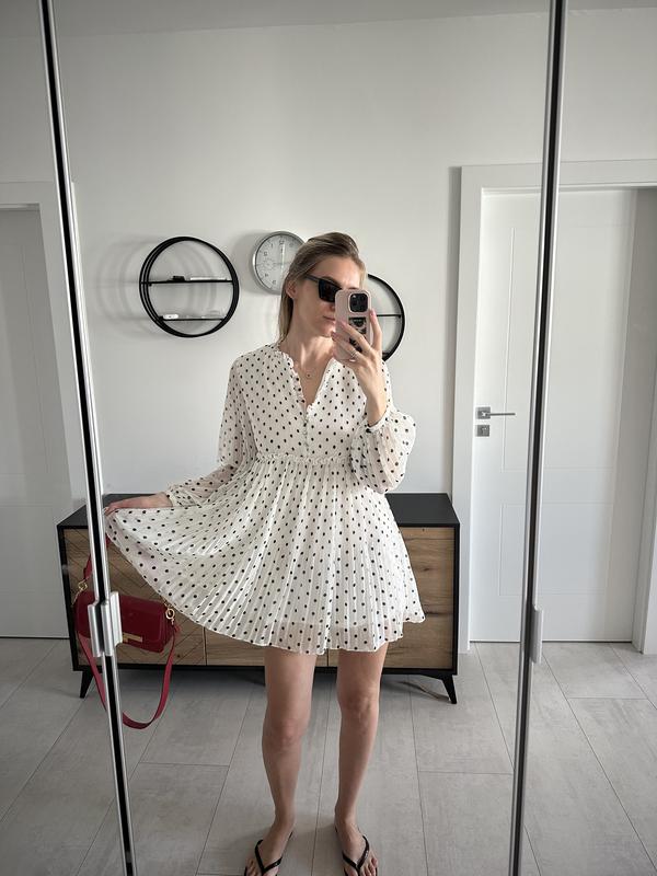 Біла сукня в чорний горох Zara. Вільного крою. З підкладкою. Ґудзики на грудях.