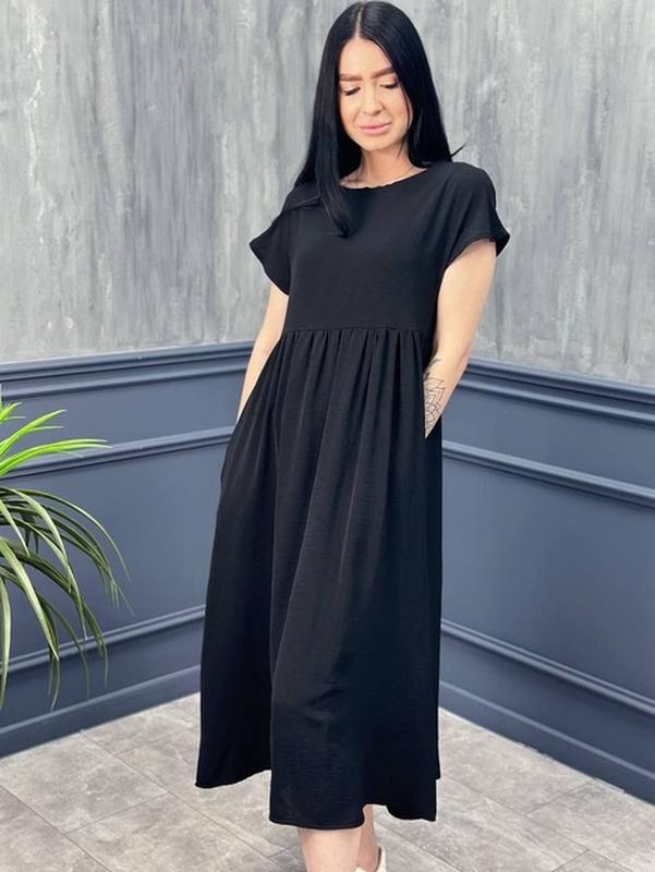 Сукня ПОГ52. . Талія розширена 55 Довжина 124. Сукня вільного крою, міді-довжина,з короткими рукавами та V-подібним вирізом горловини. Колір: Чорний. Деталі: Присутнє складання на талії, що створює обсяг у нижній частині сукні. Є бічні кишені. Склад: лен 30% + віскоза 70%