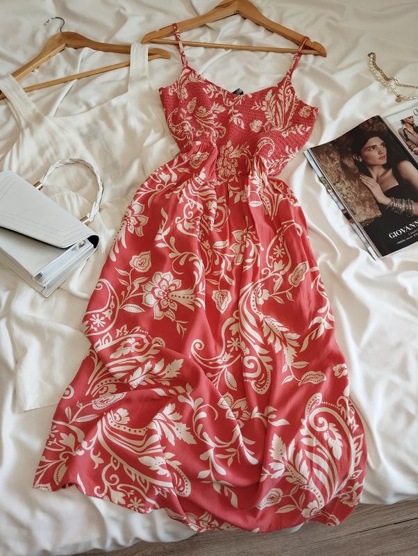 Легкое платье-миди F&F. Коралловый оттенок со светло-бежевым растительным узором. Эластичный лиф. Идеальный выбор для отпуска, или повседневных образов. Размер UK 14, подойдет M-L. Длина 115 ПОг 38 - 55 ПОт 34 - 55 ПОс 63