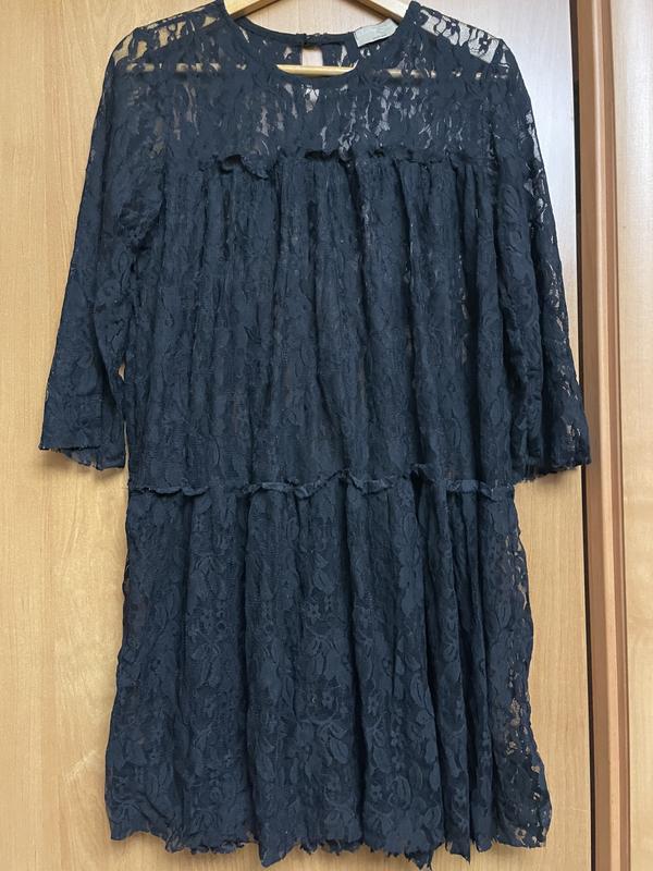 Гипюровое платье насыщенного черного цвета.Полупрозрачная хорошо тянется.Не мнется. Длина 88см Длина рукава 46см ПОП 36см ПОГ 60см ПОС 74см НИЗ 100см
