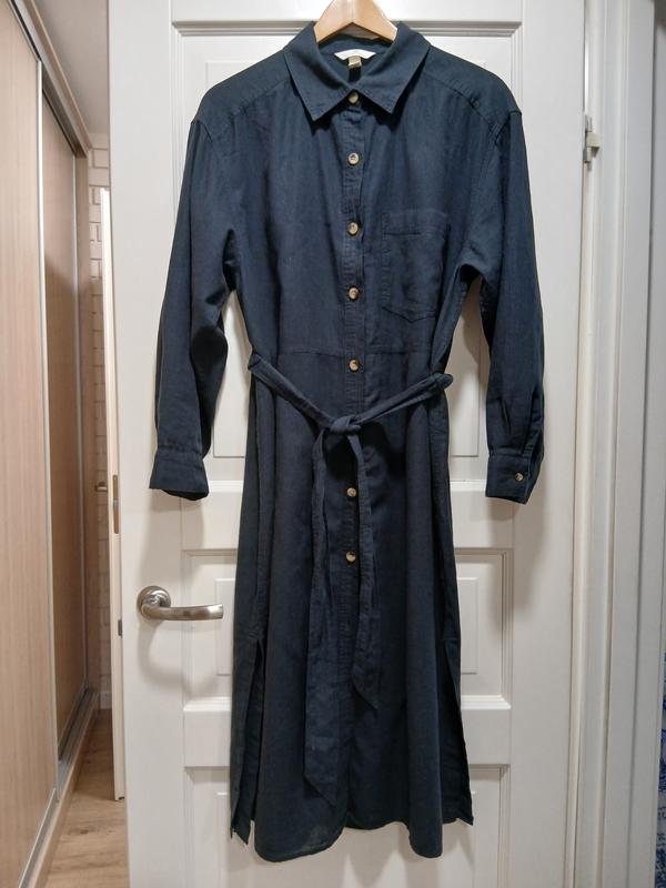 Стильное темно синее льняное платье-рубашка H&M Стан нового. Вдягнуте один раз! Размер L, но подойдет и на большее. Углядимся замеры. ПОГ - 60 см, ПОТ - 61 см, ПОБ - 69 см, плечи - 52 см, длина рукава - 55 см, длина по спинке - 116 см