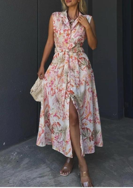 СУКНИЙ СРЕДИ ДОЛЖИН С ПРИНТОМ И ЛЬОНОМ Платье-безрукавка из смесовой льняной ткани. Рубашечный воротник. Прорезные карманы по бокам. Эластичный ремень из той же ткани. Застегивается на пуговицы спереди. Размер М, XXL СКЛАД. 70% ВЕСКОЗА. 30% ЛЬОН