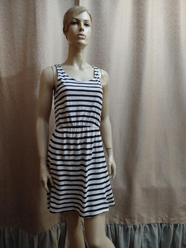 Симпатичное полосатое платье в очень хорошем состоянии. Длина изделия по спинке от плеча 92 см, полуобхват груди 42 см, полуобхват талии на резинке и тянется от 28 см до 43 см. Ткань немного тянется. Модель 6589Ю