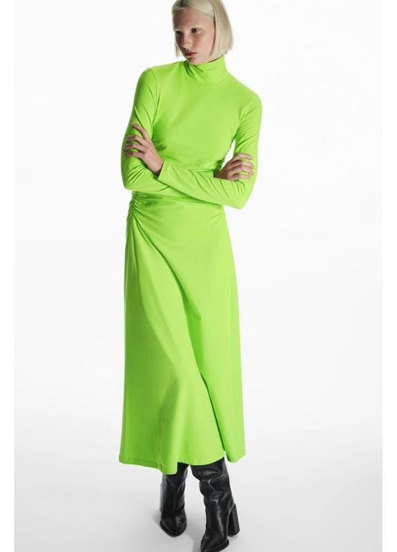 Ця вражаюча сукня – сучасний погляд на святковий одяг. Виготовлена з гладкого еластичного трикотажу яскравого неоново-зеленого відтінку, вона має облягаючий крій з щільними довгими рукавами та рюшами з боків, що підкреслюють силует. Мінімізуйте аксесуари, щоб зосередити увагу на деталях дизайну. - Високий комір - Довжина міді - Ніжний А-силуетний поділ 91% бавовна, 9% еластан / Машинне прання. Довжина спинки розміру S – 127 см / На моделі розмір S. Розмір: XS Без паперових бірок. 1140756004
