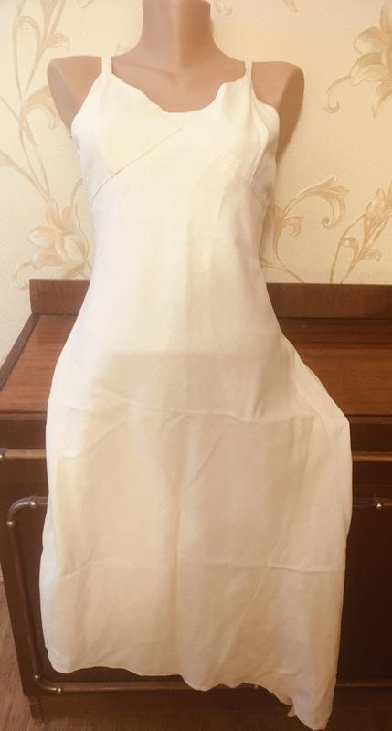 Элегантное простое платье. Низ скроен по косой. Цвет светлый беж (сливочный). На бретелях, есть подкладка. Ткань похожа на лён. Смотрится очень стильно. Подойдёт на размер 42-44, рост 168-170. Обращайтесь за замерами.