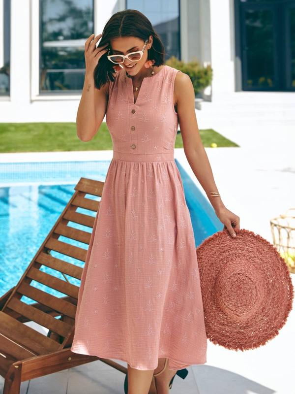 Летнее платье розовое из муслина с вышивкой в тон. Круглая горловина с V-образным вырезом подчеркивает линию шеи. Лиф декорирован пуговицами, визуально вытягивая силуэт. Отрезная по талии. Застегивается на скрытую молнию сбоку. Материал/состав: муслин (100% хлопок); Растяжимость: нет; Длина изделия: 113 см; Замеры изделия в 44 размере; Параметры модели: 84х60х92, рост 173 см. ❗ Все заказы оформляются только через ЧАТ, через кнопку КУПИТЬ ➡️ отклонены. Страна производитель ➡️ Украина. 🚛 Доставка ➡️ "Новой почтой" (2-3 рабочих дня). Доставка сплачивает покупатель. 👛 Оплата ➡️ 100% Передача на р/р ФОП "ПриватБанка" или после платья с авансом. Если посылку не забираете, аванс возвращаем по учету транспортных расходов в обе стороны. 📦 🔁 Обмен и возврат ➡️ за счет покупателя, при наличии оригинального и невредимого упаковки и ярлыков, отсутствия следов эксплуатации, стирки и ношения.