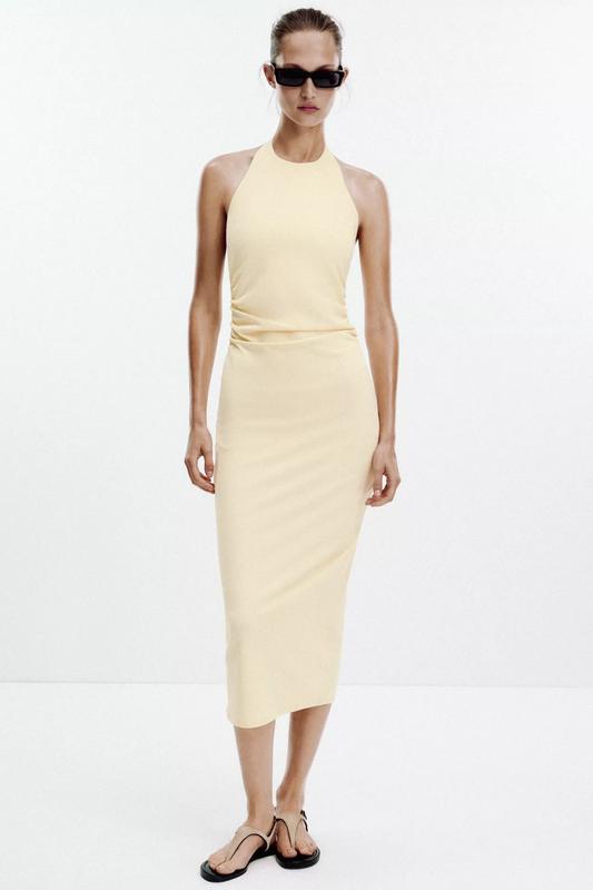 Платье с воротником халтер. Деталь с боковой драпировкой. Открытая спина. Застежка на пуговицы на шее.