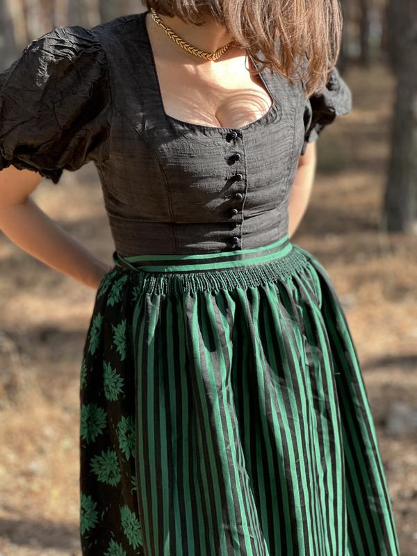 Дуже гарна, верх із натурального дикого шовку, неймовірно гарно підкреслює фігуру, красиве декольте, в комплекті йде фартух, можна носити як з ним так і без Плечі 35+рукав 35, ног 45( є місце для грудей, я носила на 92) нот 35, стегна вільно, довжина по центру спинки 109см, довжина фартуха 74см Виглядає дуже сучасно