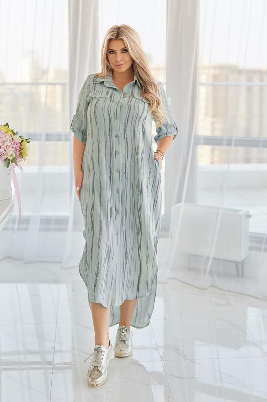 Сукня- сорочка. " Хвиля" # 1016 (ал-коз) ● Розміри - 48-50, 52-54, 56-58 ● Тканина: Креп- штапель ( жатка) + стрази спереді. Гарної якості👌 ● Фактичні виміри: За 52-54 розміром. Довжина від плеча: Спереді- 122 см. Позаду- 136 см. Рукава - 34 см. ▪︎ ОГ - 118 см. ▪︎ ОТ- 118 см. ▪︎ Обьем стегна- 126 см. ● До кожного наступного розміру додавати + 4см (на поодинокі розміри). На спарені +8см,крім довжини виробу. ● Зріст моделі на фото- 170см. На моделі одягнений: 52-54 розмір. ▪︎ Параметри моделі на момент зйомки: БЛОНДИНКА: ОГ- 115 см. ОТ- 85 см. ОБ- 120 см. ● ФАСОН ТА ДЕТАЛІ: Сукня-сорочка вільного прямого силуету — стильний і практичний варіант як для святкових подій так і на кожен день. ▪︎ Відкладний комір і застібка на ґудзики по всій довжині. ▪︎ Рукав 3/4 з фіксацією патика. ▪︎ Спереду — дві імітаційні планки-клапани. ▪︎ З боків — розрізи для зручності при ходьбі. ▪︎ Ушиті кишені для максимального комфорту. ▪︎ Акцент — блискучі стрази гарної якості, делікатно розташовані по передній частині. ● ДОДАТКОВІ ХАРАКТЕРИСТИКИ: ▪︎ Тканина: креп-штапель — легка, м’яка до тіла, не просвічується, має легку фактуру. ▪︎ Стрази на тканині фіксовані професійно, не обсипаються при пранні. ▪︎ Не потребує складного догляду — можна прати у пральній машині. ▪︎ Добре підходить для спекотної погоди — тканина дихає. ▪︎ Створює візуально витягнутий силует, не обтягує. ▪︎ Ідеальна для жінок plus-size: модель не підкреслює проблемні зони, а навпаки — маскує їх. ▪︎ Поєднується як із взуттям на підборах, так і з кедами чи мокасинами. Кольори виробу: Чорний. Пудровий. Ніжно- блакитний. Мята.
