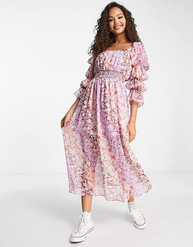 Платье шифоновое миди летнее в цветочный принт miss selfridge с разрезом на ноге и обьемны...