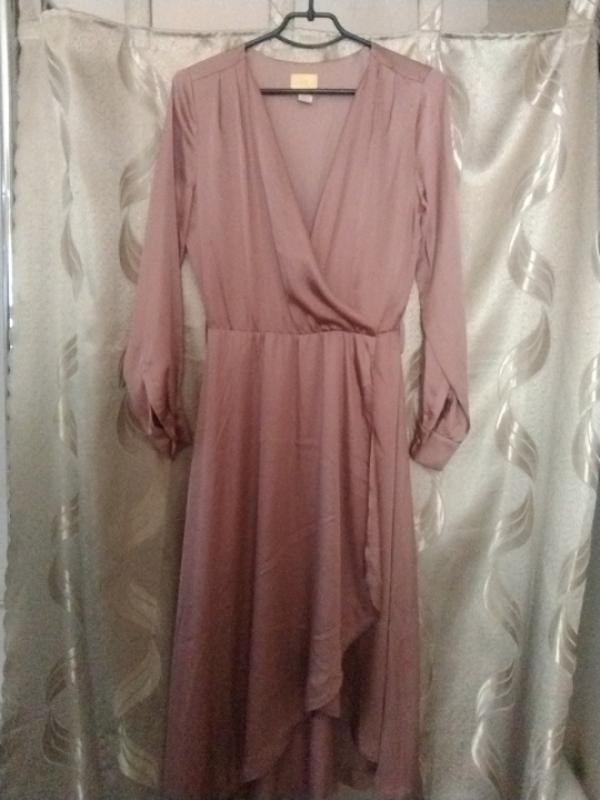 тоненькое платье насыщенное цвет темной пудры с атласным переливом это ткань с характерным блестящим лицевым боком и матовой изнанкой. запах сверху и снизу, все метрическая, талия на резинке, рукава на пуговицах на 44-46 укр.