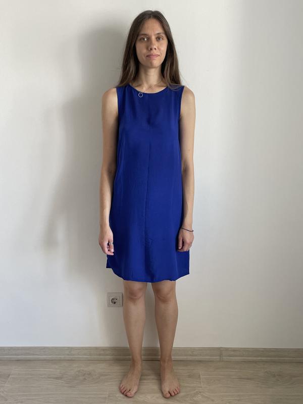 Літня легка сукня Стримана, на кожен день під кросівки і для офісу під класичне взуття На тілі відчувається невагомою Колір синій 50% котон 50% віскоза Форма трапеції Довжина 92 см Ширина 54 см Мої параметри: 84-66-94 Зріст 178 см