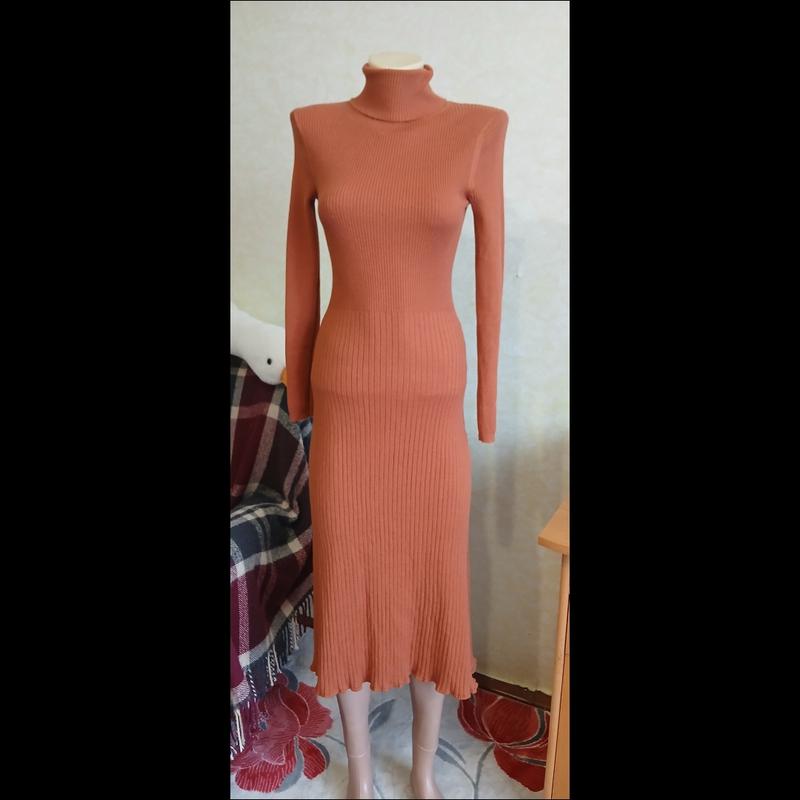 758 Теплое женское платье-гольф в рубчик, для стройной девушки. Хорошо тянется. Состояние очень хорошее. Размер XS/S Ширина плечей 32 см Полуобхват груди 30 см Полуобхват талии 25 см Полуобхват бедер 37 см Длина рукава 57 см Длина 117 см.